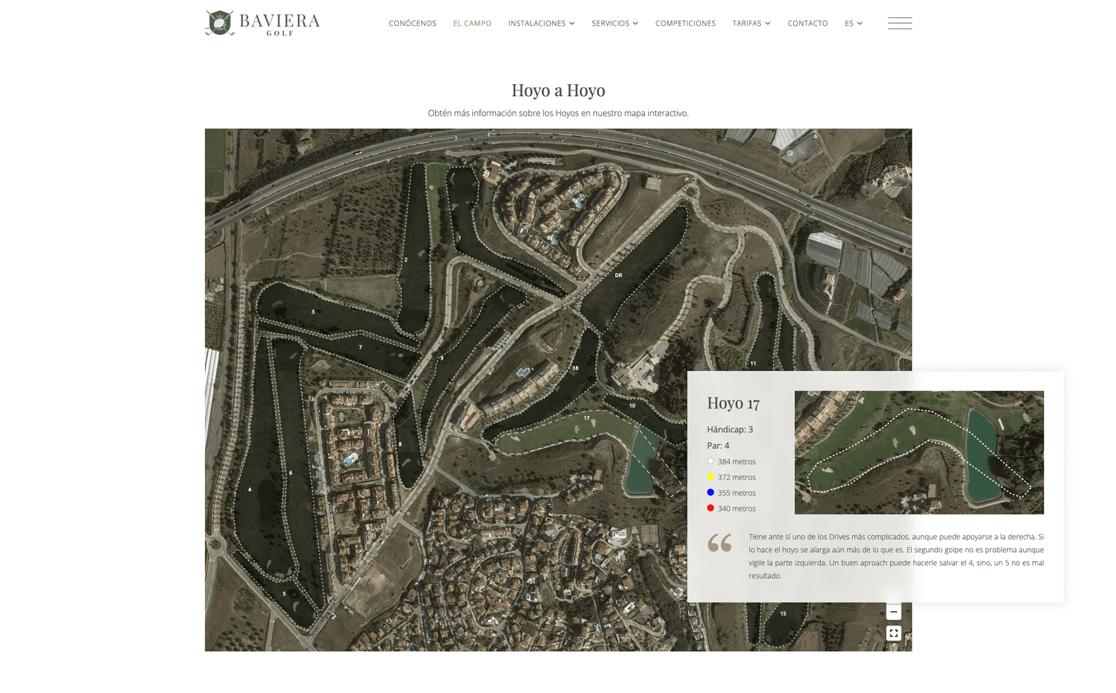 Rediseñamos la web totalmente a medida, con un estilo limpio, visual y elegante. Integramos un mapa interactivo del campo que permite explorar cada hoyo de forma realista. Propusimos un logotipo renovado, que fue adoptado por el cliente, y organizamos un shooting profesional del campo, el equipo y las zonas comunes. También producimos un vídeo corporativo en español e inglés con voz en off, y unificamos el diseño en todos los canales digitales. La web se conectó directamente con la sección de precios y servicios, y todo el proyecto «branding, web y contenido visual» se entregó de forma conjunta dentro del marco de una subvención.